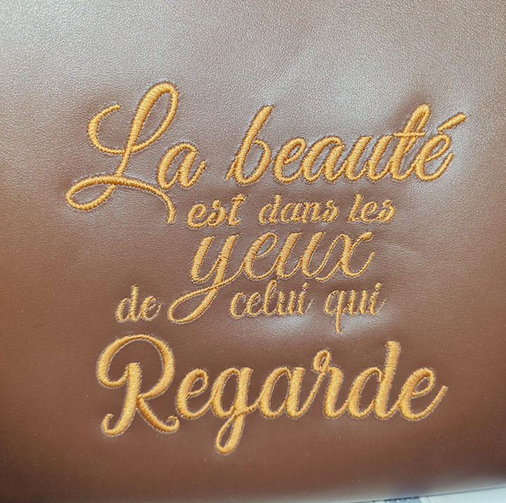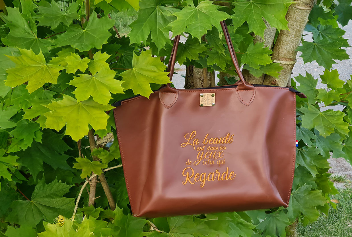 Teinte chocolat profonde, silhouette équilibrée, message brodé avec précision : ce sac se distingue par sa sobriété chic et son âme affirmée.
